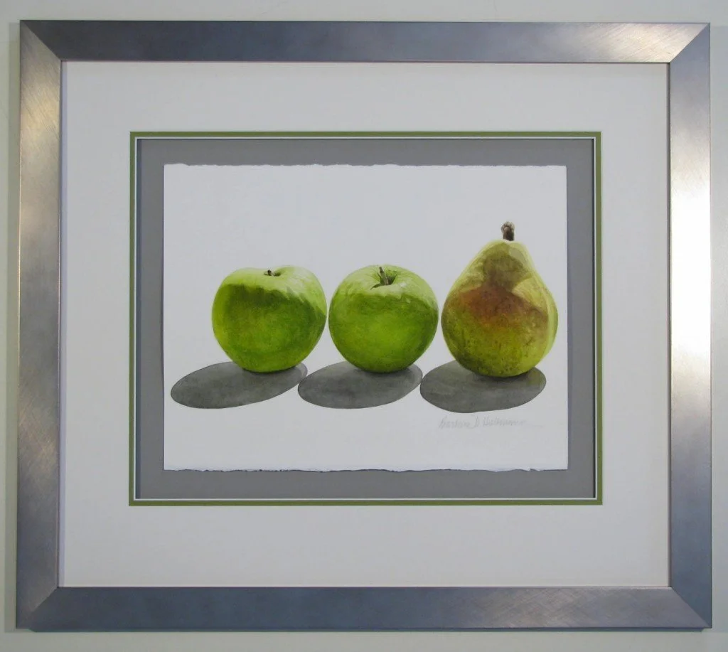 Watercolors are often subtle and beautiful manifestations of the artist’s creativity and skill. They tend to be somewhat muted in intensity, and that softness needs to be considered in the framing design. Watercolors are also very light sensitive, so conservation glass is highly recommended to slow fading. Conservation principles specify that the glass be kept off the surface of the painting so that any condensation behind the glass does not damage the painting. And acid-free conservation mats and backing boards are to be used to preserve the art, of course.